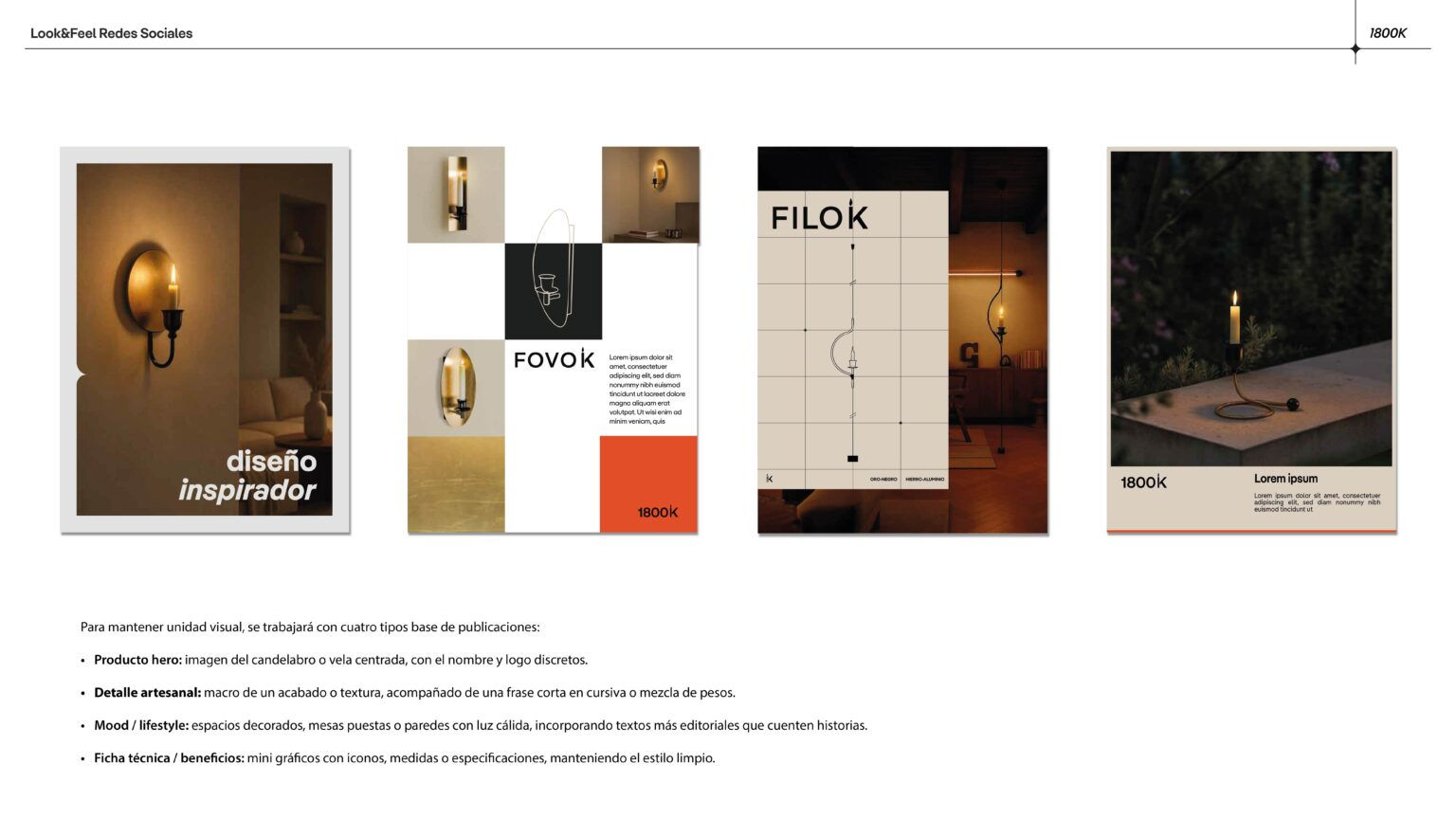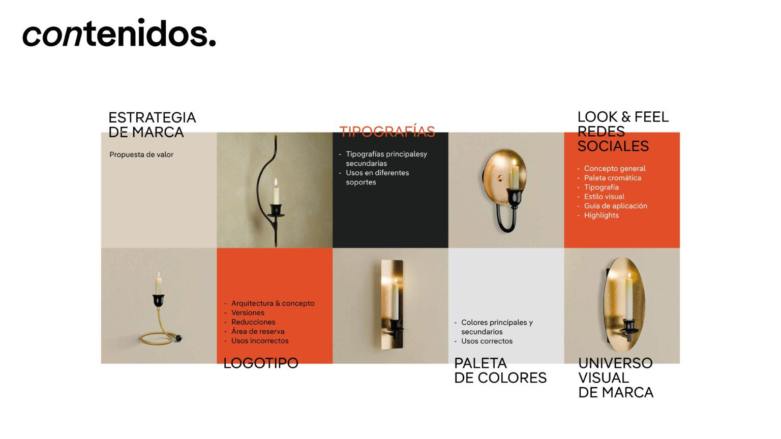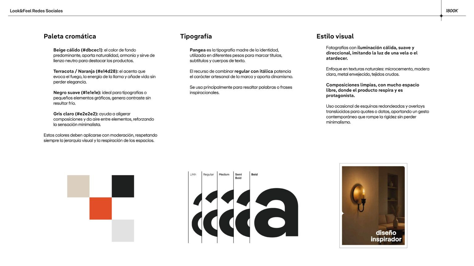 Realizamos un rebranding integral, el diseño de su catálogo corporativo y un Look&Feel global, con el objetivo de transmitir artesanía, sofisticación y lujo contemporáneo. La nueva identidad se inspira en la luz de una vela a 1800 Kelvin, con un estilo minimalista, geométrico y refinado.